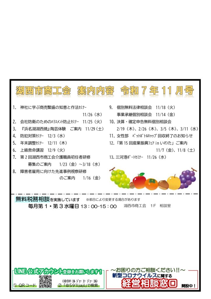 湖西市商工会「会員発送」令和7年11月号のご案内 Tweet 毎月、月初めに送らせていただいております「会員発送」令和7年11月号のご案内となります。以下のURLよりご確認下さい。 令和7年11月号会員発送 Tweet