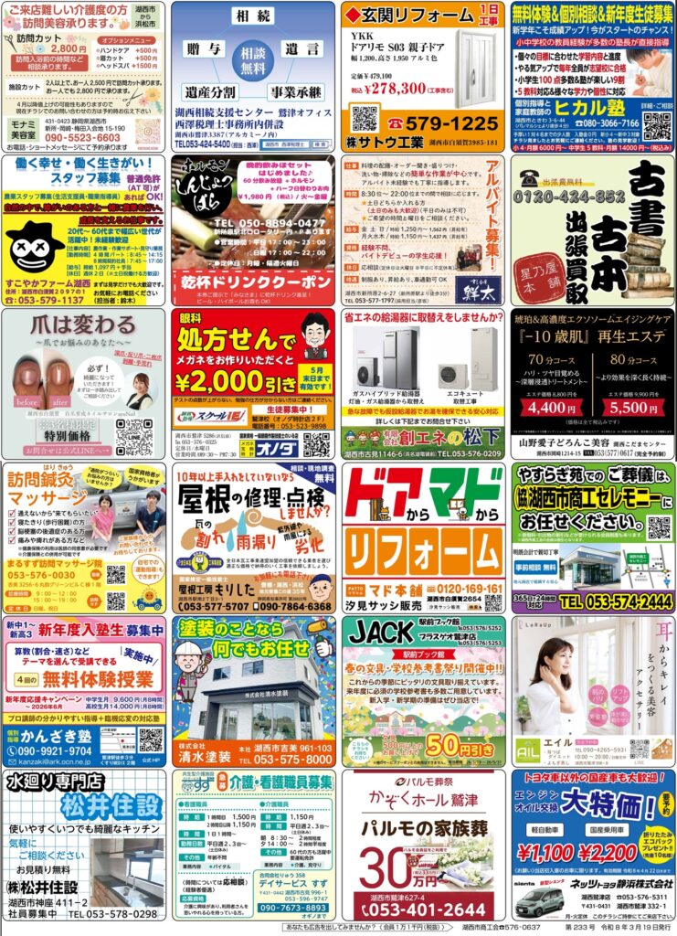 毎月恒例の「共同宣伝チラシ」令和8年3月号が3月19日(木)に、湖西市内の朝刊に折り込みされました。Web版は以下の画像をクリックしてご覧ください。